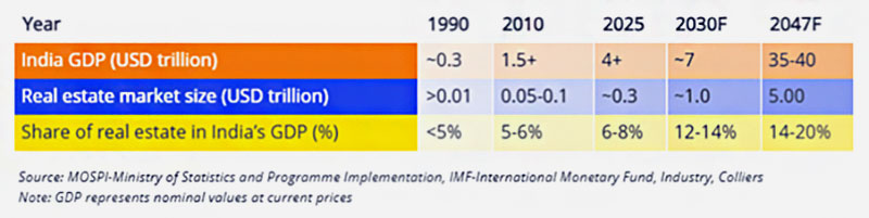 India’s real estate market is projected to grow from ~USD 0.3 tn in 2025 to USD 1 tn by 2030 and USD 5 tn by 2047[1], making it a key pillar of economic growth. Its contribution to GDP will rise from 6–8% in 2025 to 14–20% by 2047[2], driven by urbanization, infrastructure, and policy support.