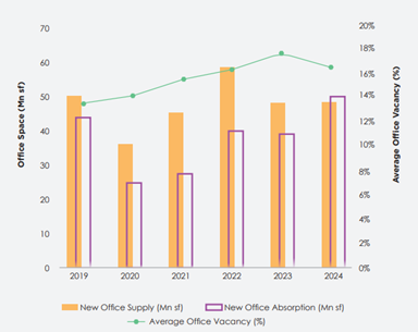 2024 marked a record high for office leasing at 81.7 million sq. ft. (msf), with major contributors of demand being technology firms (42%). Vacancy rates have declined from over 17% in 2021 to around 15% in 2024. India’s office market maintained strong momentum, recording about 42 million sq. ft. (msf) of leasing activity in H1 2025.