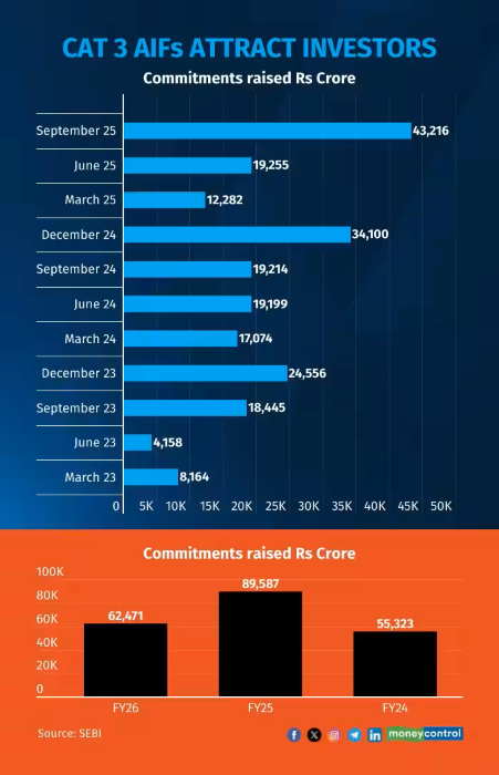 Sebi data reviewed by Moneycontrol has shown that Cat III AIFs have mobilized commitments worth Rs 62,471 crore during the first half of FY26, already touching nearly 70 percent of the full-year tally of FY25, which saw inflows of Rs 89,587 crore.